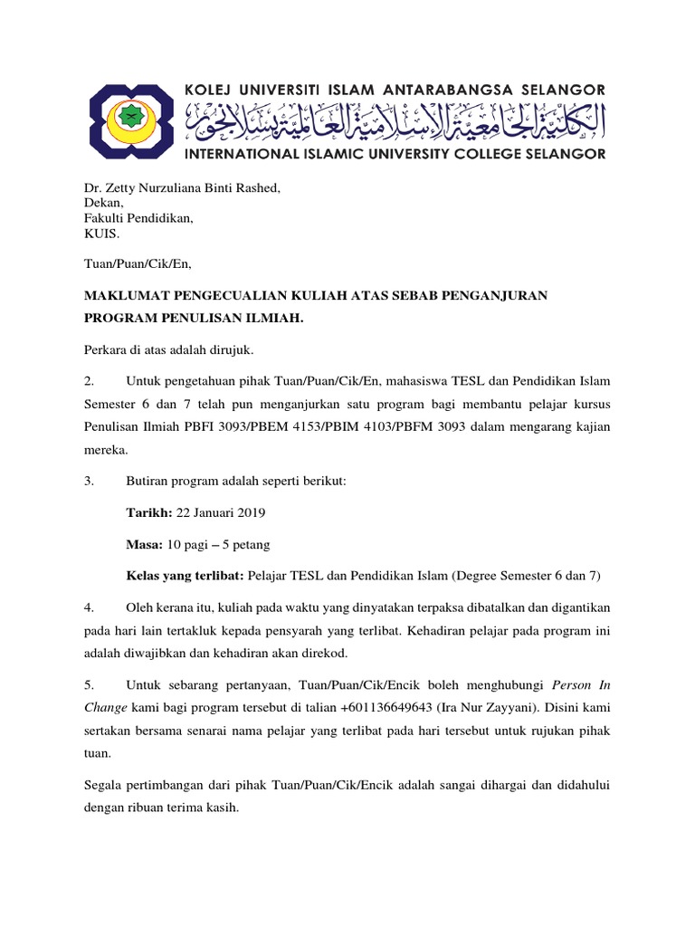 Contoh surat resmi yang disusun oleh individu adalah surat lamaran kerja, atau surat pengunduran diri yang mana cara penulisan. Pelepasan kuliah sempena sambutan hari mpp upm 2012 official facebook. If you are looking for contoh surat permohonan berhenti kuliah you ve come to the right place. Contoh surat tidak hadir kuliah kebanyakan tutor mengalami masalah berkenaan kehadiran pelajar dalam tutorial mereka. Berdasarkan pengumuman kemlu pegawai setempat yang terpilih akan ditugaskan pada beberapa fungsi yang ada di perwakilan.